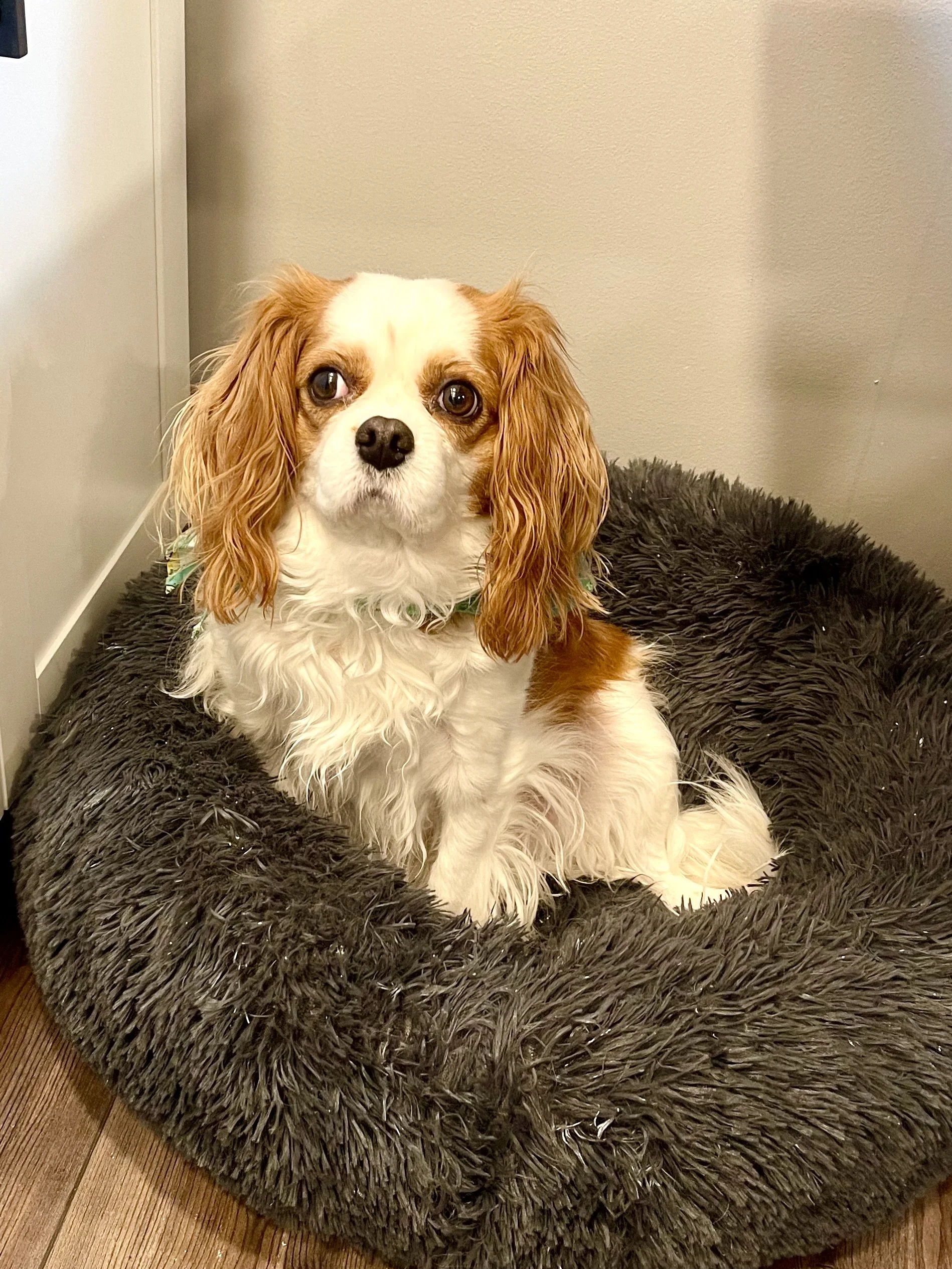Piper brings the sparkle. Curious, cheerful, and always ready to entertain, she keeps the energy light and the mood lifted. Whether she’s trotting around greeting visitors with wiggles and kisses or curling up for a classic Cavalier afternoon nap, her joyful spirit fills the space.